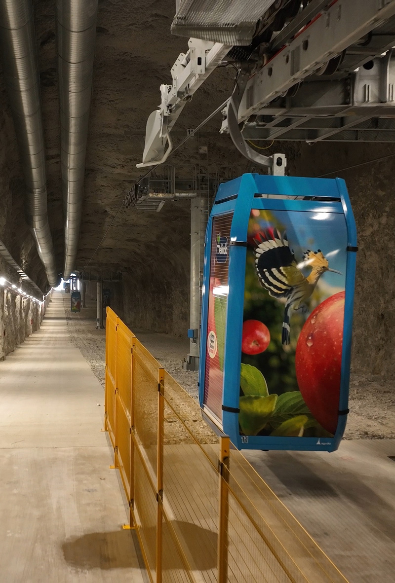 Un filo sospeso che accompagna con dolcezza il raccolto, dalla sala di lavorazione di Predaia fino alle celle ipogee della Miniera di Rio Maggiore. L’impianto permette di trasportare 150 tonnellate di mele all’ora, evitando circa 5.000 viaggi di tir su gomma.