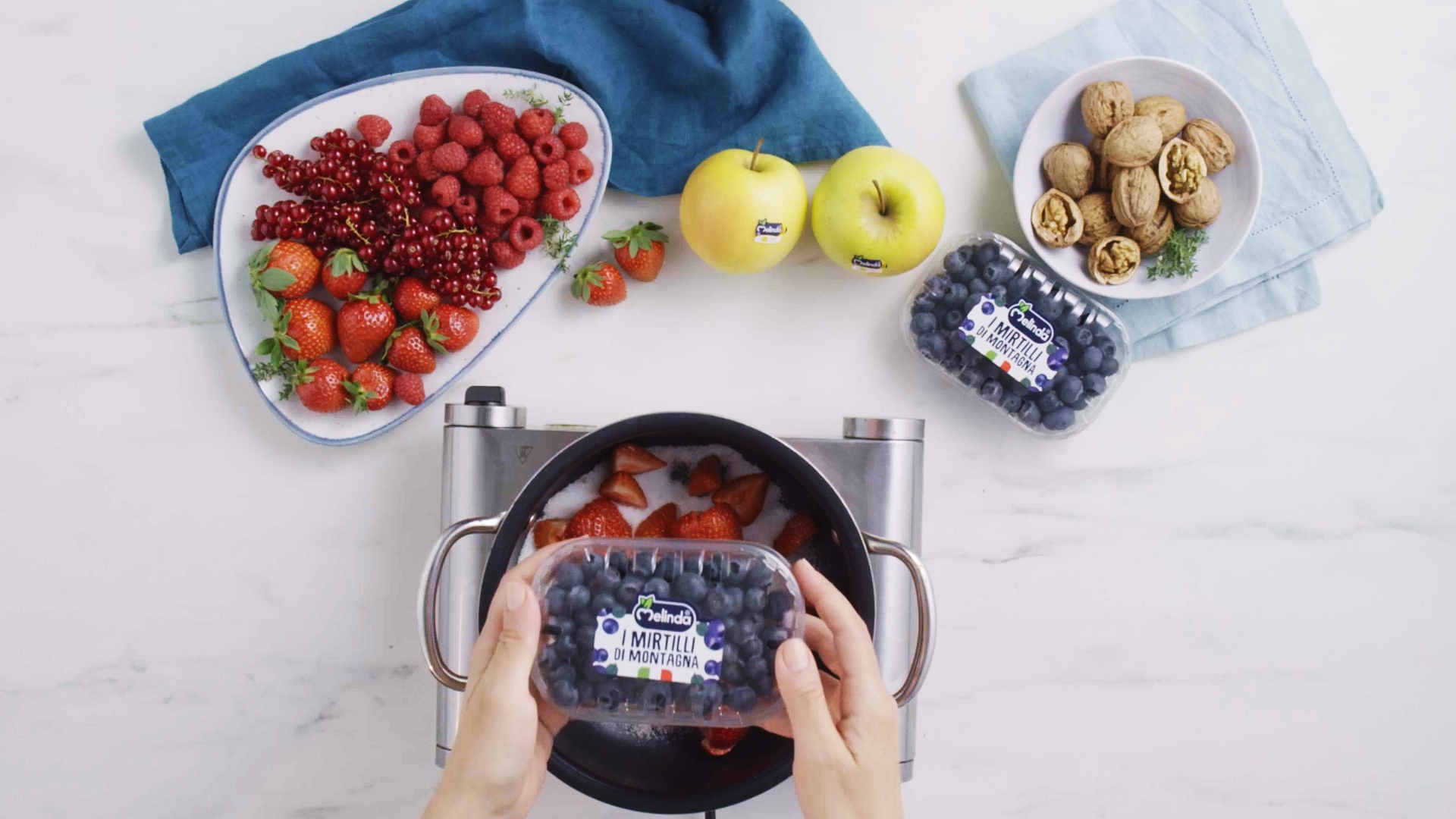 Versate in un pentolino lo zucchero, le fragole, i mirtilli, i ribes, i lamponi, 150 g di acqua e cuocete a fiamma bassa per 20 minuti.