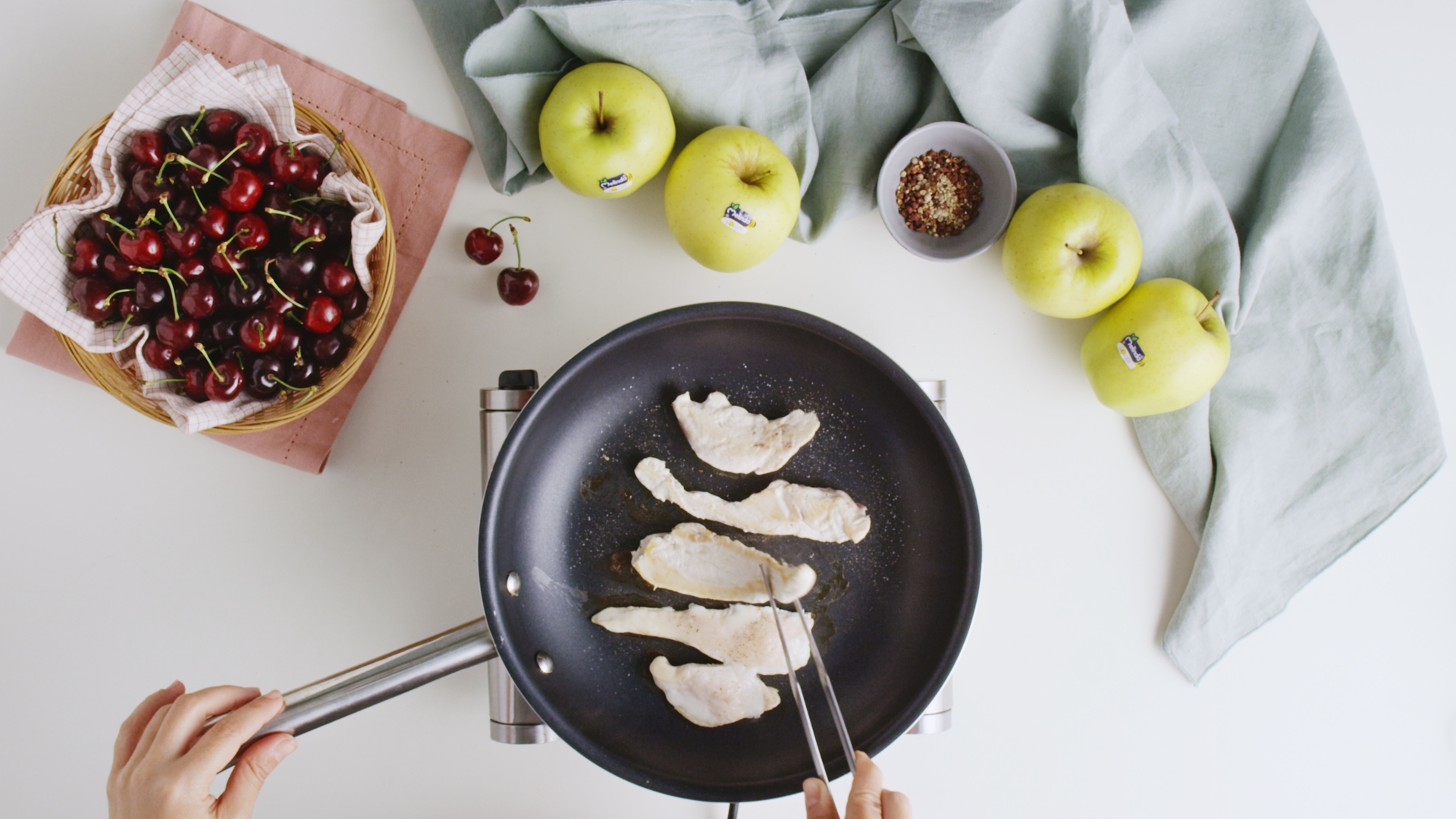 Servite il pollo caldo con la salsa di ciliegie Melinda e l’insalata verde a lato.